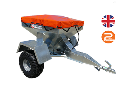 Constructed from 2mm & 5mm steel, the TGF350 is designed for use behind an ATV, UTV or 4×4 (off-road only) for easy towing across woodlands & moorlands without being too heavy. Mudguards and PVC tonneau cover come as standard along with a heavy duty, high torque motor operating a variable vain spinning plate to provide strength & reliability. The electronic drive module only runs when feeding, meaning minimal wear occurs on the machine when travelling thus reducing the burden on the towing vehicle and easy operation.